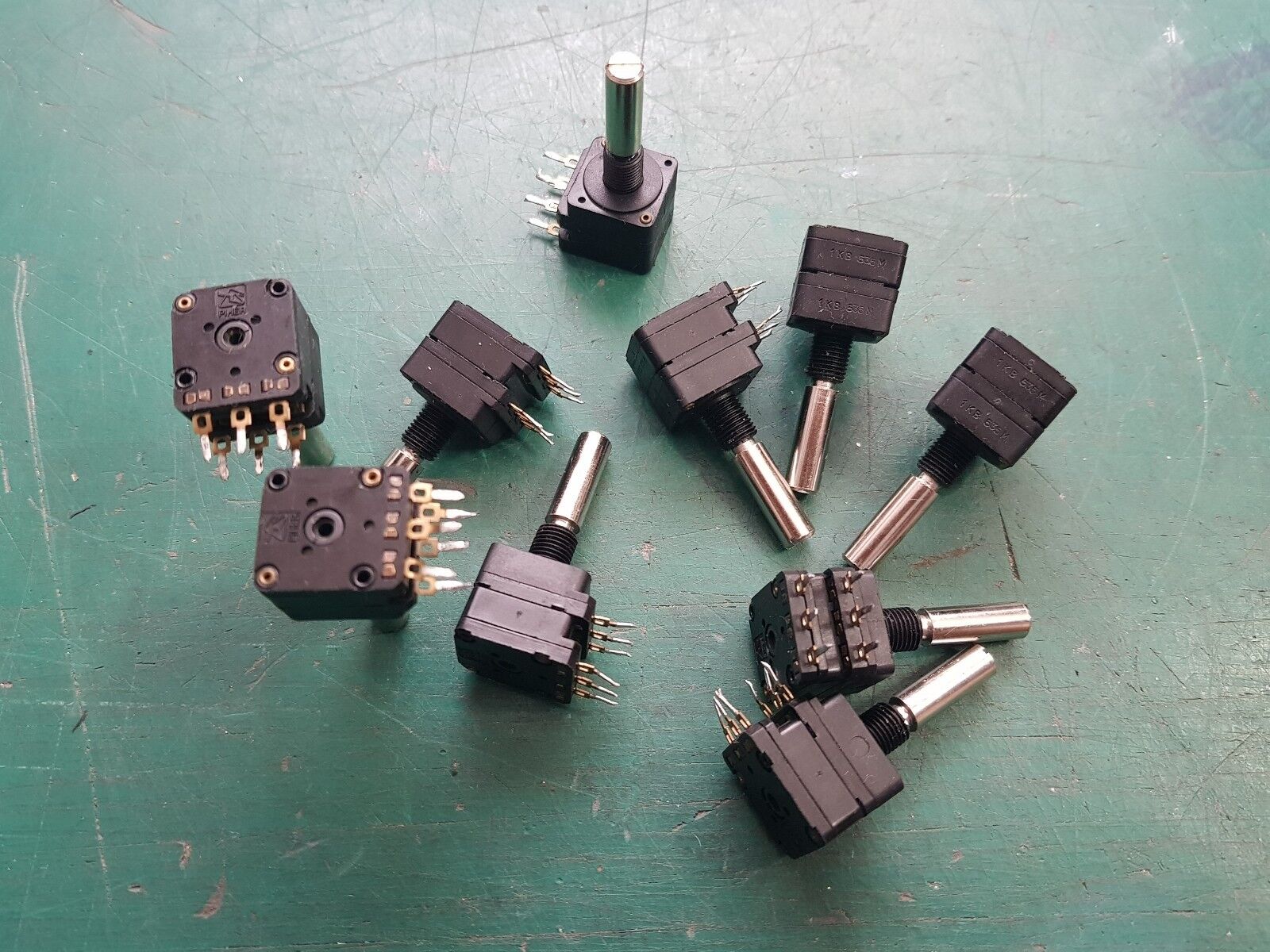 Genuine Piher dual gang linear potentiometers taken out of military equipment. All in working condition. These are 1k pots. The shaft is 6mm in diameters and is about 19mm long. All are sealed dust proof potentiometers. All have metal shaft. 10pcs