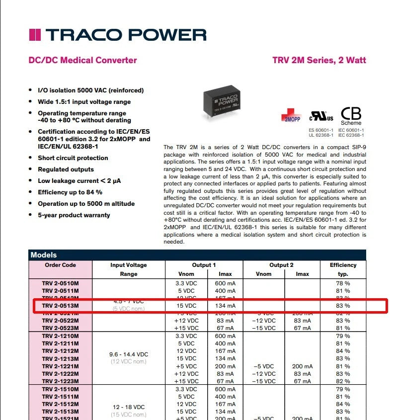 10pcs TracoPower 2 Watt DC DC Converter TRV 2-0513M 15 v 134mA Isolated 5Kv