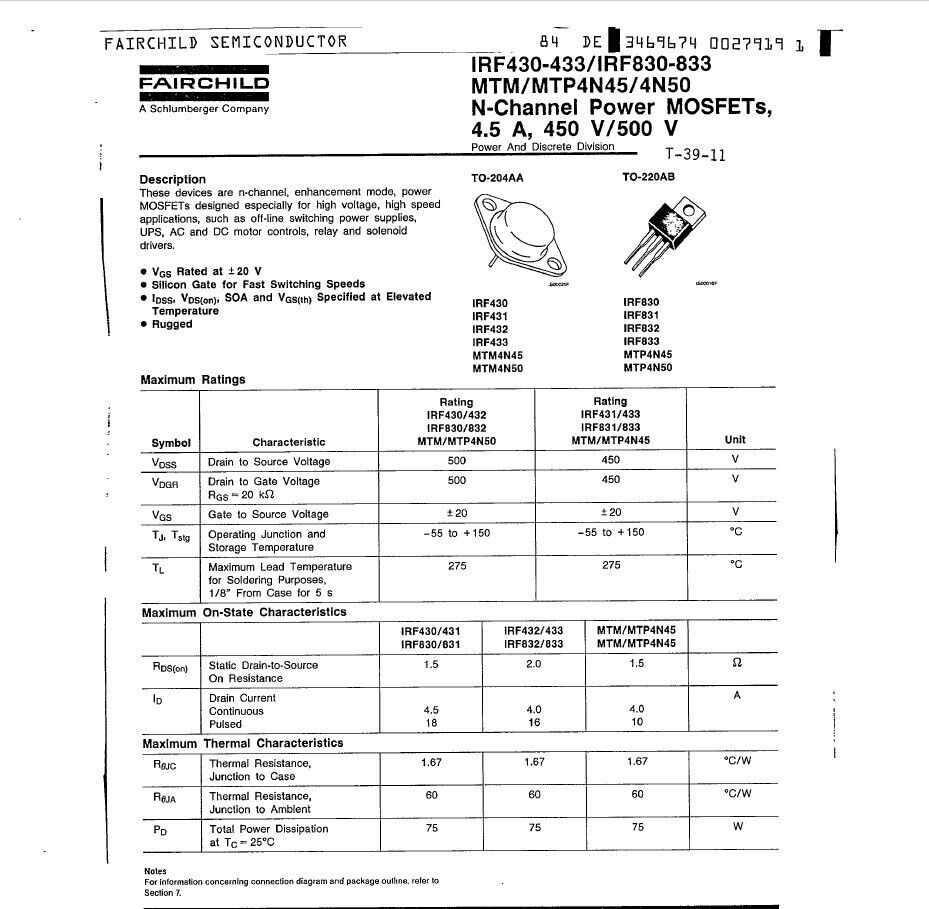 Genuine IFR431 / HP Agilent part 1855-0454 450v 4A power N channel mosfet in TO3 package. all been tested and are in full working condition.Couldn't load pickup availability