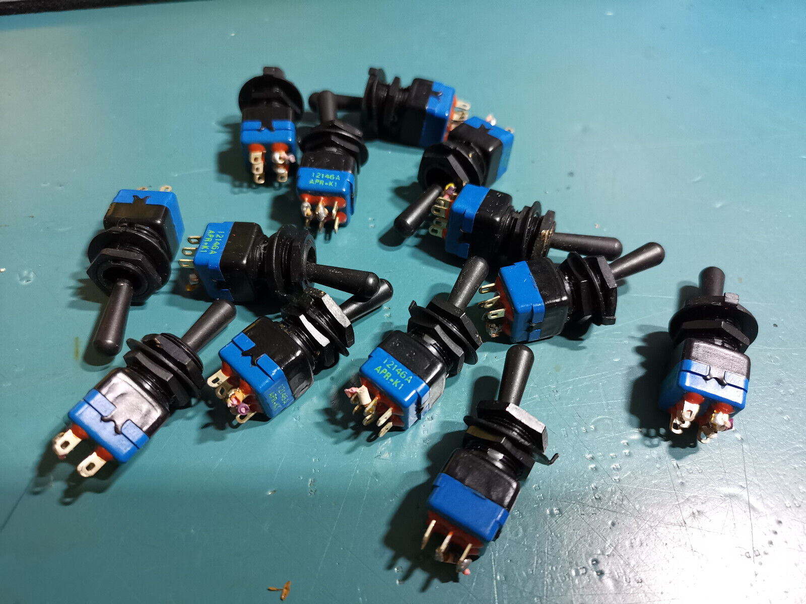 Genuine APEM toggle switches from military aircraft cockpit instruments. All in full working condition. These are On - ON type. But can also be used as ON - OFF type.these dont have centre rest. 13pcs