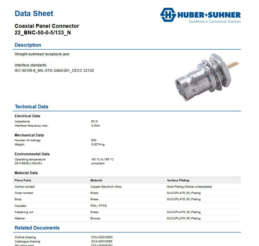 DC To 4GHz 50 Ohm BNC Connector Beryllium Copper Alloy HUBER SUHNER