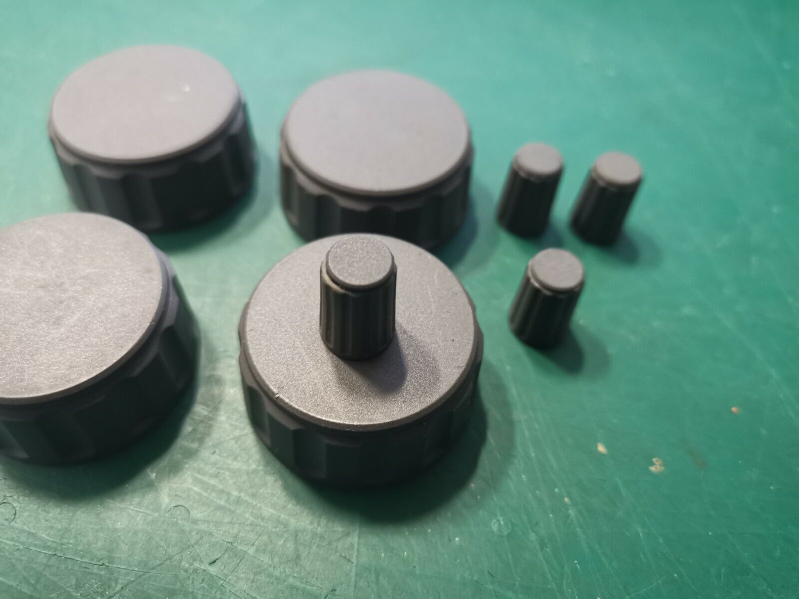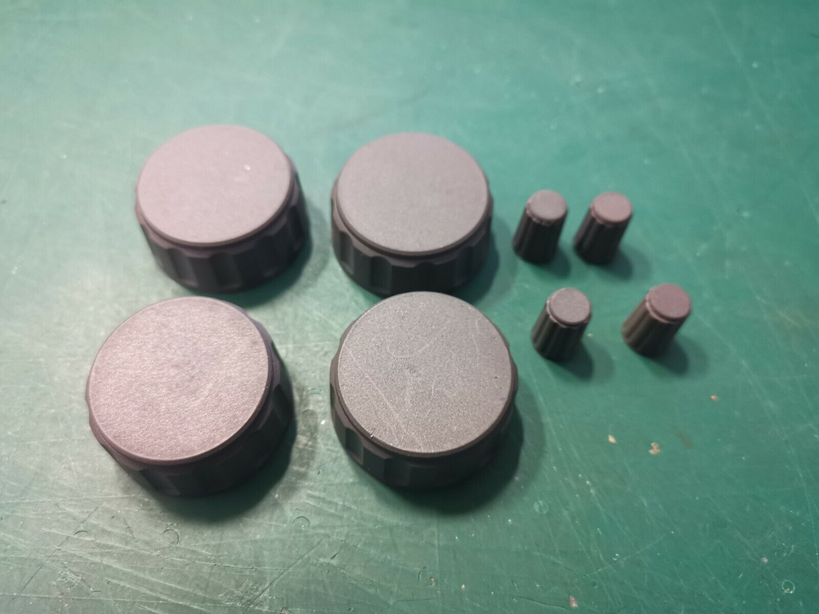 High quality knobs taken out of RF test gear. 4 large and 4 small ones. All are identical and matching.The large ones have diameters of 36mm and accommodate for 6mm shaft. The smaller ones have a diameters of 10mm and take 3mm shaft. All are 15mm in heights.
