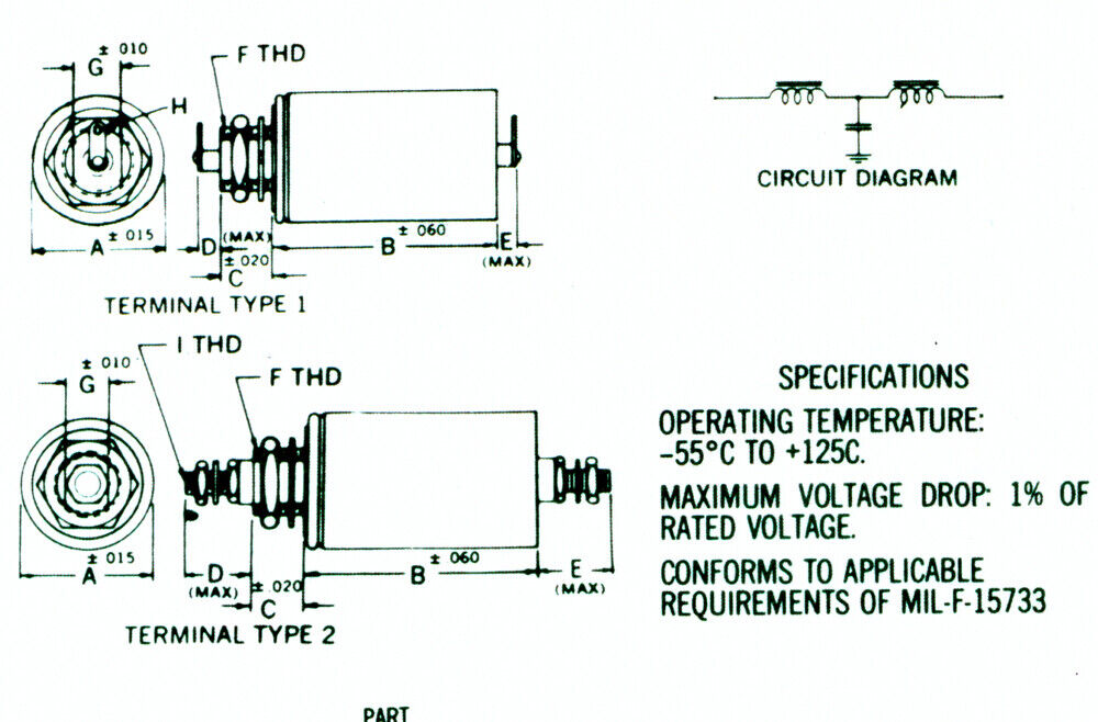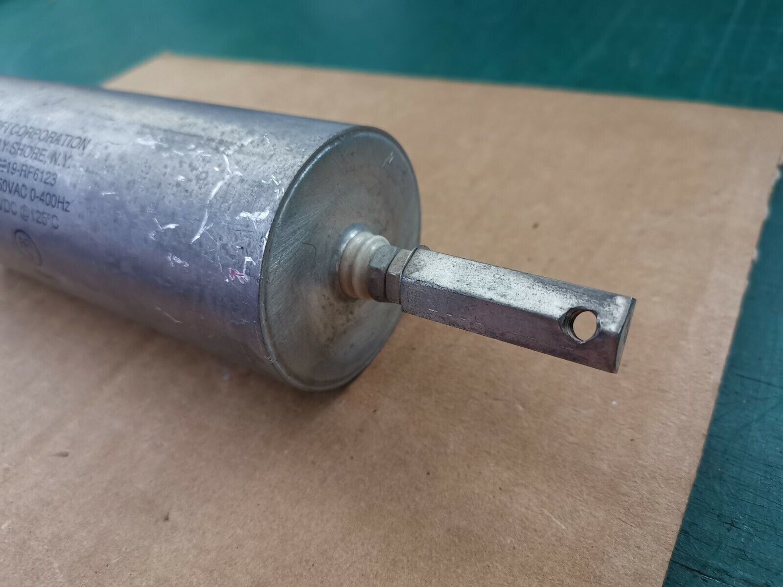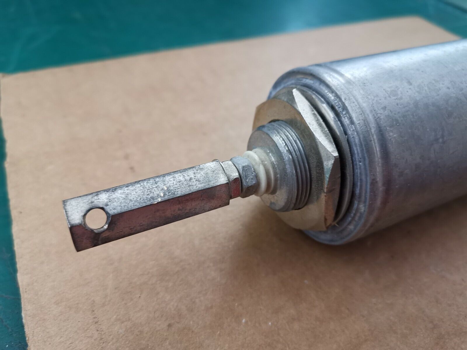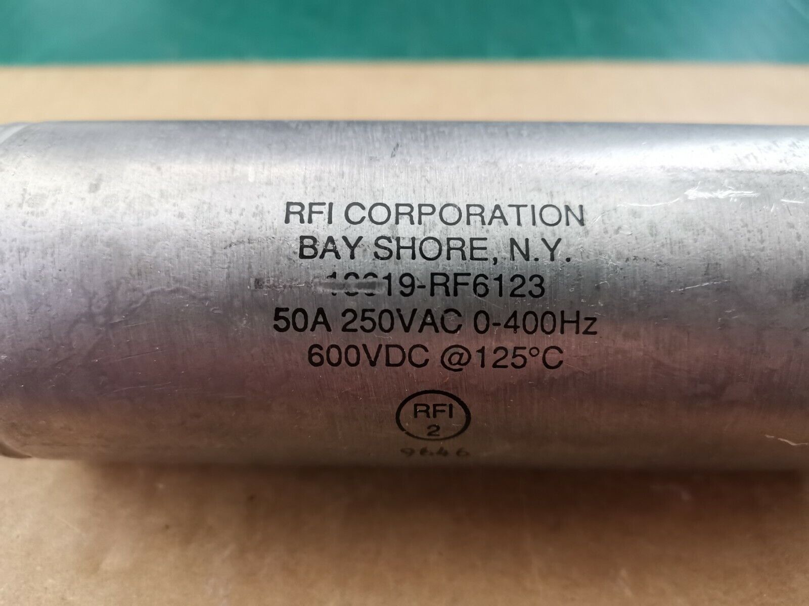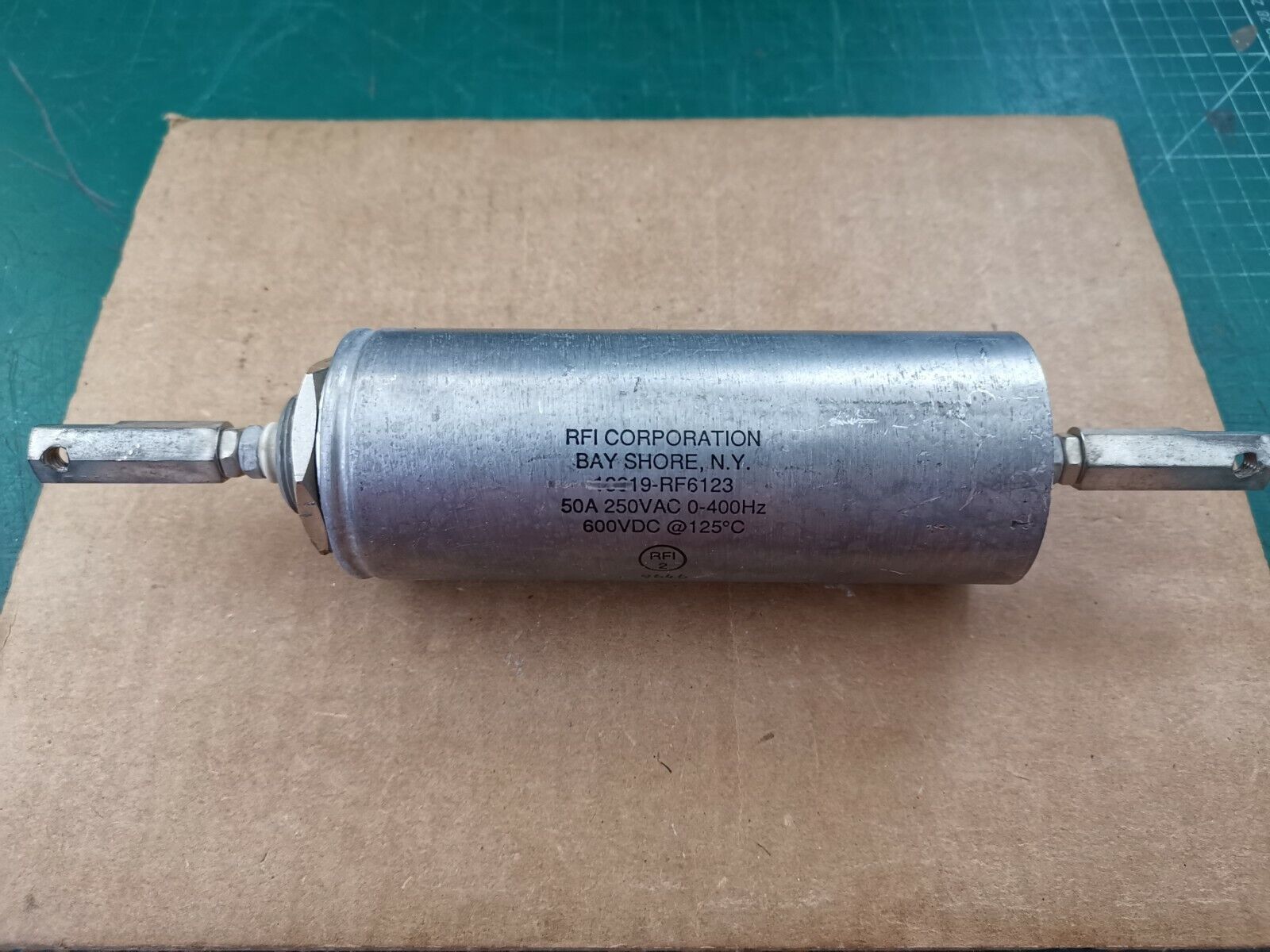 Genuine RFI corp cylindrical filters in T circuit type from military hanger. All in fill working condition. The capacitance is around 2uF. Rated for 250AC or 600V DC and upto 50A. Built to military specThese are used inline with power rail to filter RFI and EMI.
